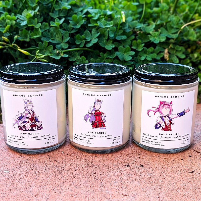 Preorder your Umamusume candles now! Haru Urara, Gold Ship, and Oguri Cap are here to celebrate Year of the Horse.